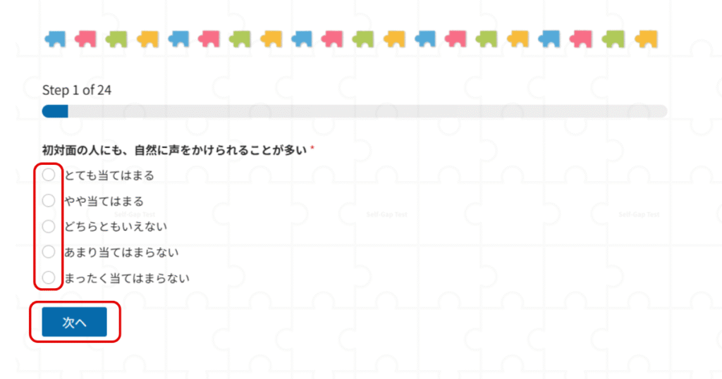 1つ回答を選んだら、次へボタンでテストを進めてください。※戻るボタンはありません。